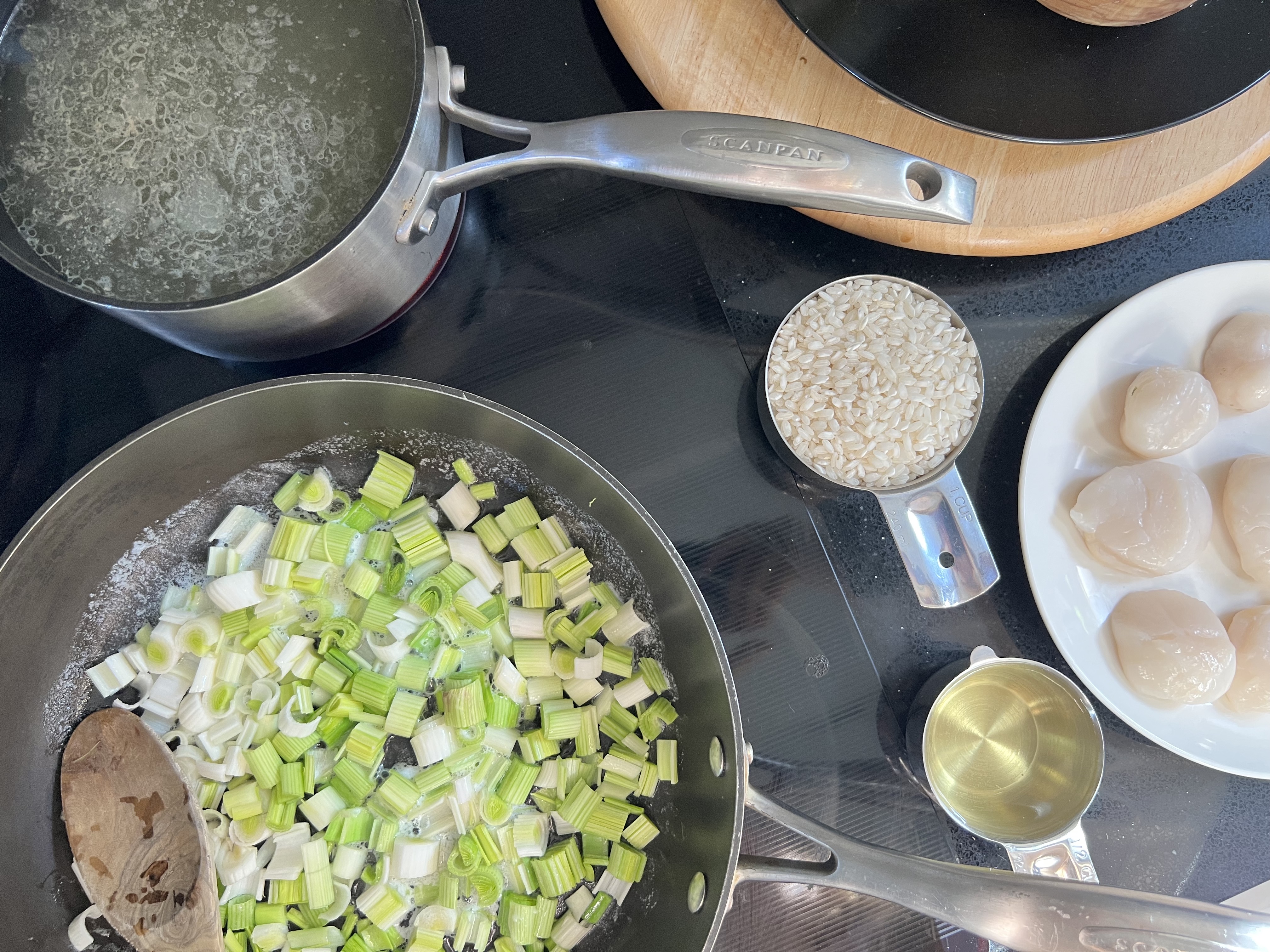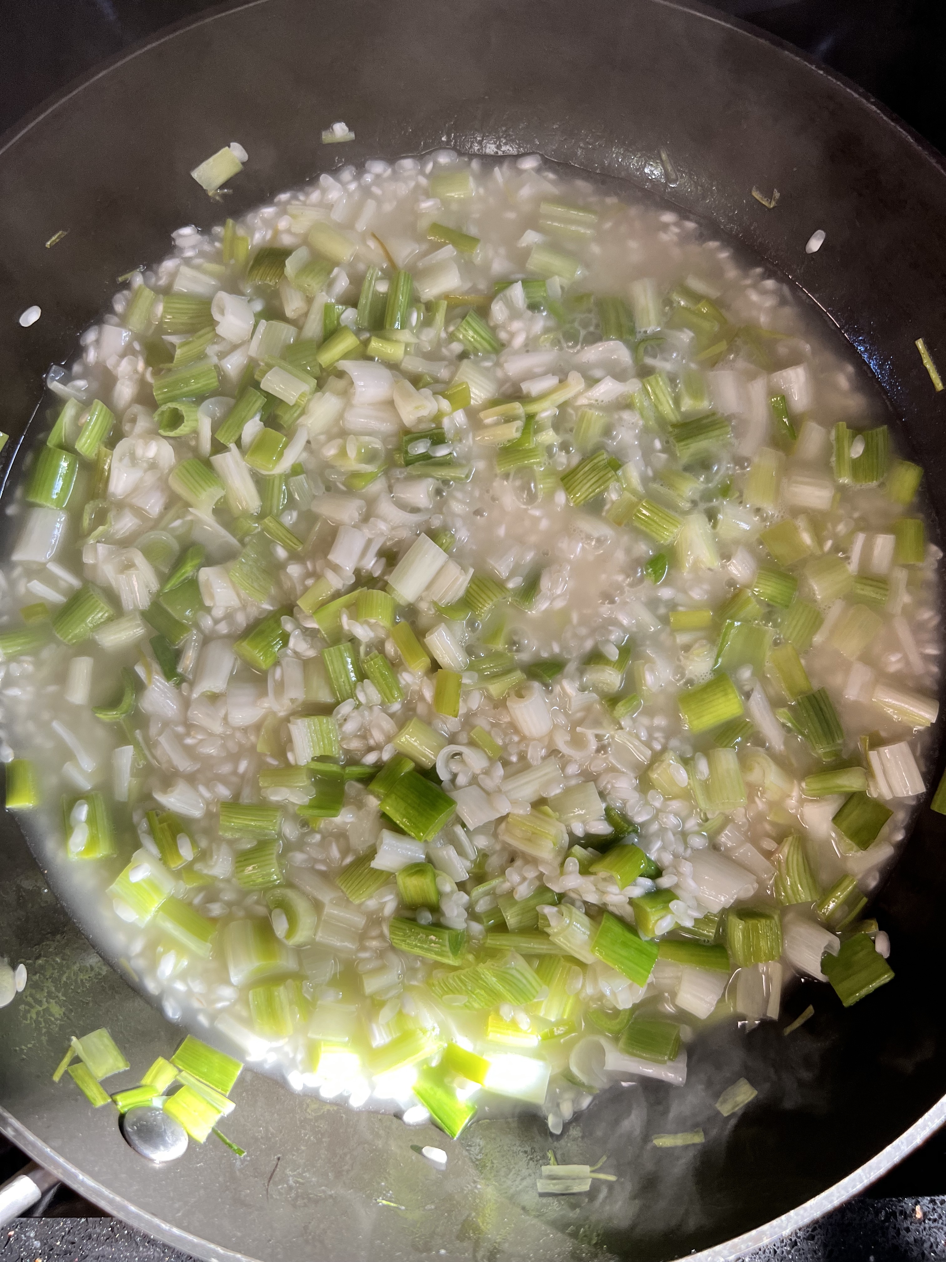 - When you are satisfied with the texture of the rice, [time to turn the scallop pan to high-heat] allow the remaining liquid to cook out until when you pull the rice away from the center of the pan and no longer liquid pools to the center. It should take 3-5 minutes, and requires more frequent stirring.